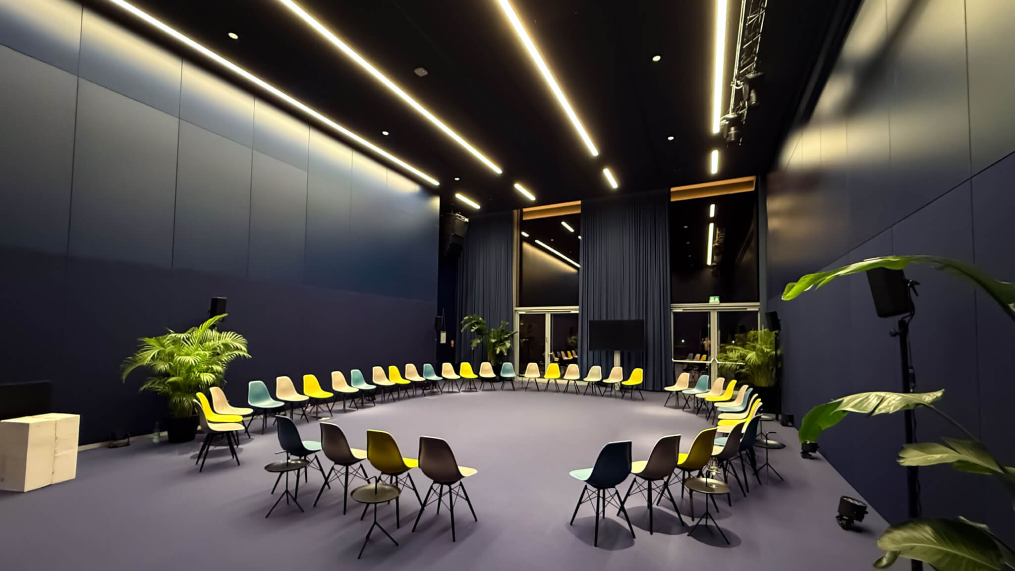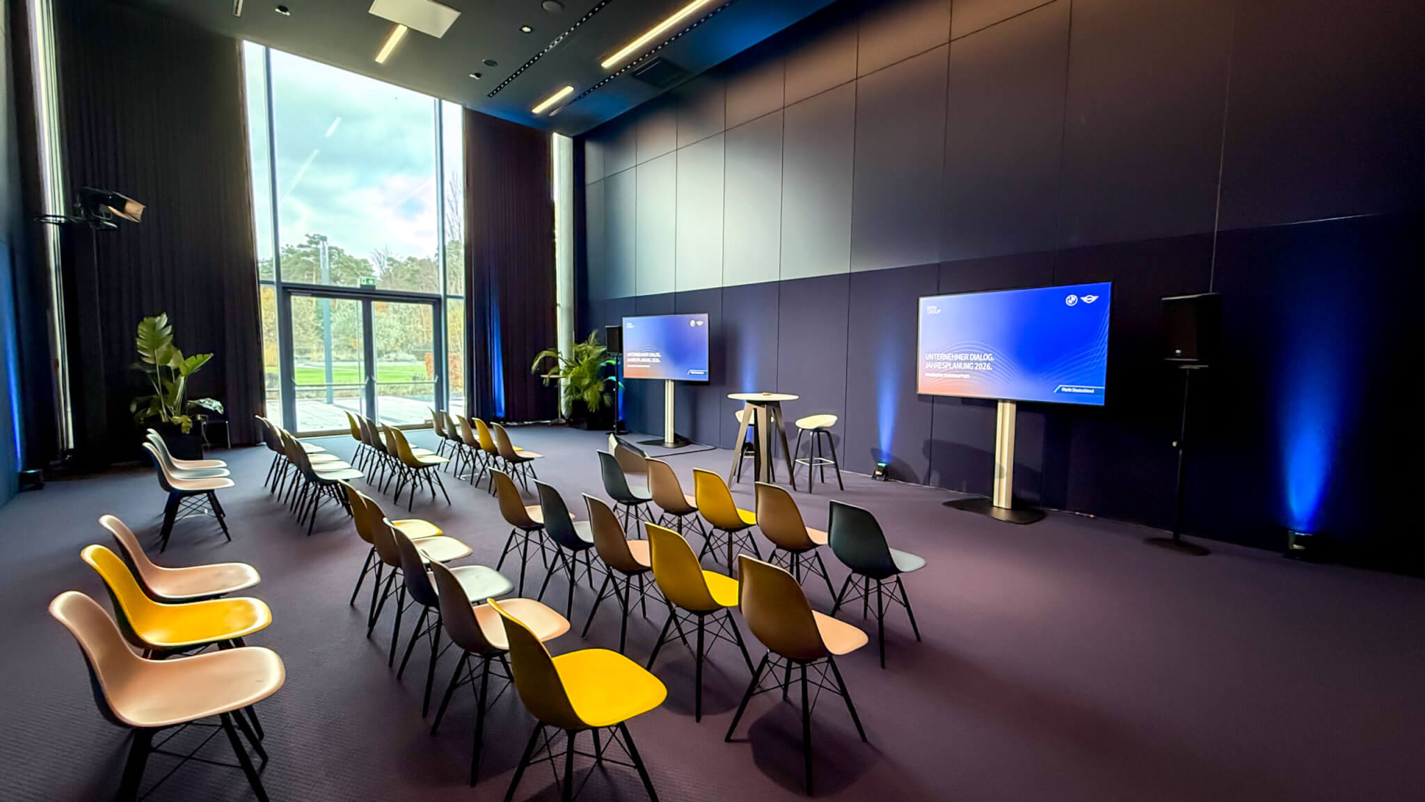 Im Plenum stellten wir mit einer kleinen Bühne, einer Rückwand aus AluVision-Modulen, zwei 98“ Displays und einem fein abgestimmten Beschallungs- und Lichtkonzept den passenden Rahmen für Keynotes und Präsentationen. Unser Regieteam sorgte wie immer für die präzise technische Durchführung und nahtlose Übergänge zwischen den einzelnen Programmpunkten.